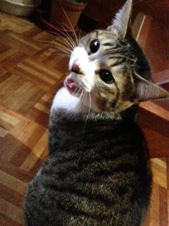 玄関、4つん這いになって戻ると、猫のお出迎え。